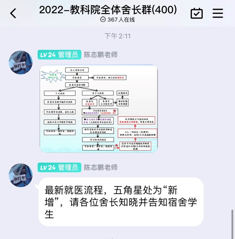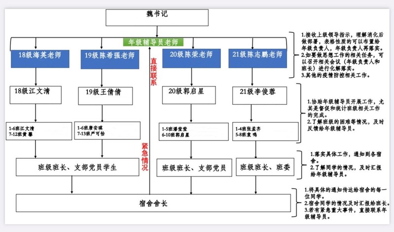 教育科学ky开云网页版app把防控网络布置到每一幢楼宇,把关心关爱汇聚到每一间寝室,细化防控范围,实现精确防疫。网格化管理分层次实行舍长落实机制和监督保障机制。年级总负责人、班级负责人、分管宿舍负责人实施督促保障机制,开展各项疫情防控工作,传达疫情防控信息,监督常态化核酸检测工作,督促和完成年级的相关数据统计工作,关注学生心理状态,了解学生最新需求,保证学生正常生活。舍长实施落实机制,督促全体寝室成员认真、及时完成各项疫情信息登记、核酸检测、健康打卡、检测截图收取等疫情防控工作,每日对宿舍成员进行体温测量,督促宿舍成员出宿舍戴好口罩,不信谣、不传谣、不私自举办或参加聚集类活动,积极配合楼层长日常晚归检查工作。宿舍网格化管理的两大机制切实做好了管控到点、服务到人的工作,保证疫情防控顺利进行,使宿舍疫情防控网精准覆盖到每一个在校学生。