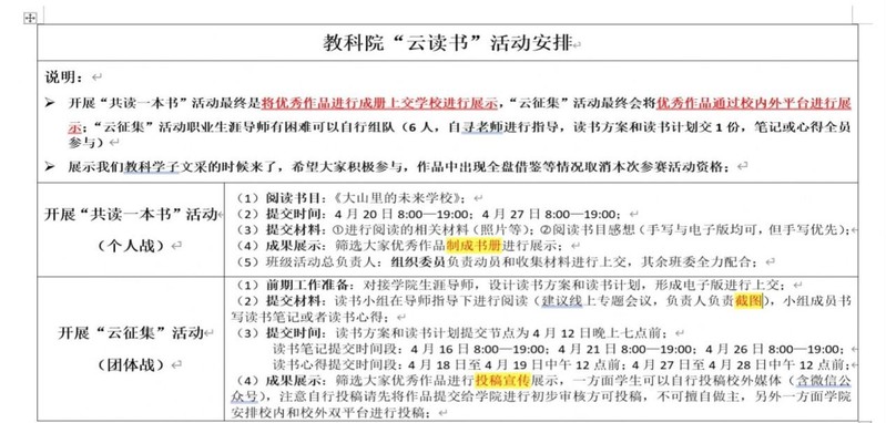 活动准备前期,我们和老师商讨活动如何进行才能更有意义,才能让同学们都能获益匪浅。在这期间,通过多次开会讨论,我们挑选了一系列优秀的阅读书目,决定了“云征集”活动让各班以阅读小组的形式开展,各个小组对接职业生涯导师,由职业生涯导师领导,从而让大家能够更深层次地理解所读书目。而“共读一本书”活动则由班委带领大家在线共读《大山里的未来学校》,让大家自主阅,自由交流,畅所欲言,并将阅读感悟写下来。
