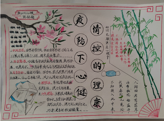 虽已春暖花开,但在疫情形势下校园长时间的封闭管理可能会带来焦虑、压抑等情绪,教工第三党支部及心理学系在配合学校疫情防控的同时,在“心理防疫”这个特殊战场上,充分运用专业优势,组织应用心理学专业学生开展了主题为“心理抗疫· 疫起同行—我为盐师出谋划策”系列活动,从多方面普及“心理防疫”知识,包括手抄报、海报制作、动画制作、PPT等,为抗击疫情贡献专业力量,让大家保持积极健康的心态。