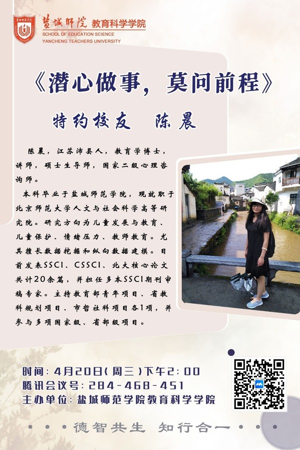 为了切实加强疫情期间ky开云网页版app学风建设,营造良好学习氛围,强化组织育人功效,全面提高教学质量和人才培养质量,教育科学ky开云网页版app于4月20日下午两点开展了线上“潜心做事,莫问前程”校友讲座。¬本次校友讲座邀请了教育学博士、硕士研究生导师、2009级校友陈晨作为主讲嘉宾,由教科院学工办主任海英主持。
