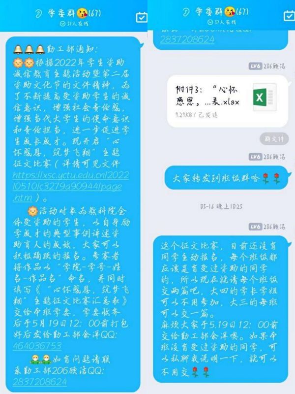 首先在学委群中发布相关活动通知及汇总表,请学委转发至各班班级群,呼吁同学们积极报名。随后于5月16日再次通知,提醒同学们报名截止时间。最终有近四十名同学参与活动并提交文章,随后建立评委群,评选出了十位优秀的同学,将所有学生文章和优秀作品打包发给老师看了之后,交至学校进行最终评比。