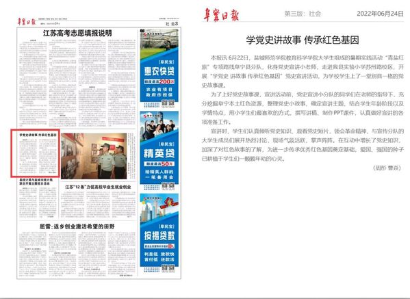 为在暑期中学习红色故事、感悟红色精神、传承红色基因,盐城师范ky开云网页版app教育科学ky开云网页版app大学生组成的暑期志愿活动“青盐红旅”专项路线,积极响应时代的号召,开展各项社会实践活动,感受红色革命党史的党性教育和精神洗礼。