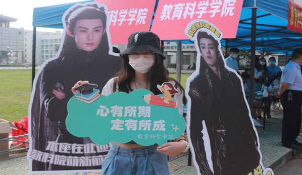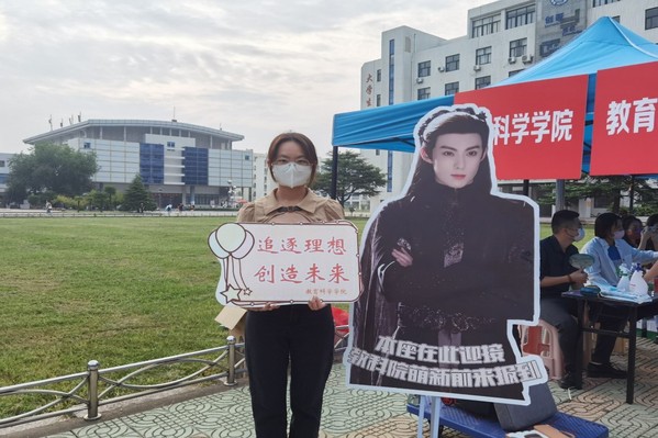 属于教科院的天蓝色迎新棚沿着花圃逐个排开,老师和学长学姐们在棚内翘首以盼。近期大热的影视主角的人形立牌,也在迎新棚处欢迎新生的到来。