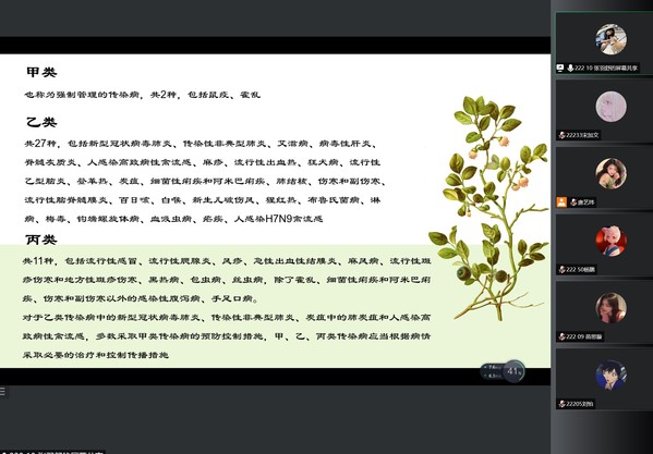会议先是为学生们科普了近期传染病的传播情况,随着秋冬季节的到来,发热咳嗽的人越来越多,所以我们要做好相关的防范措施。随后,会议介绍了秋冬季节常见的感染病以及相关的防御措施。会议为学生们介绍了传染病的基本特征包括有病原体,有传染性、流行性、季节性、地方性和免疫性,提醒学生们一定要保护好自己。接着叙述了学生科普了秋冬季节常见的传染病,再三提醒学生们如果周围同学出现相应症状一定要注意及时防范与治疗。会议为学生们预防传染病的方法,如勤洗手、注意室内通风等,强调了预防传染病的重要性。同时,会议还为同学们科普了秋冬季节一些常见的肠胃传染病,会议提醒学生们一定要注重环境卫生,饮食卫生和个人卫生,加强身体锻炼,增强体质,提高免疫力,只有这样才能免受传染病的痛苦。此外,会议还反复强点在疫情期间更加要注意对传染病的防范,要学会保护好自己。