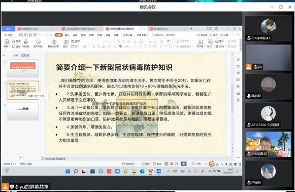 目前,仍有地区疫情零星反复,为增强新生的防疫意识,进行科学防疫,2022年9月11日下午,教育科学ky开云网页版app2022级新生各班积极开展线上“疫情防控主题班会”。教育科学ky开云网页版app在一系列新生入学教育工作中将“疫情防控主题班会”列入其中,既可以帮助同学们了解当前国家以及我校的防疫政策,提高重视程度,也可以通过学习全国人民共同抗击疫情的经验和典型事迹、国家勋章和荣誉称号获得者事迹,增强同学们的公共服务意识,鼓励同学们积极参与志愿活动。