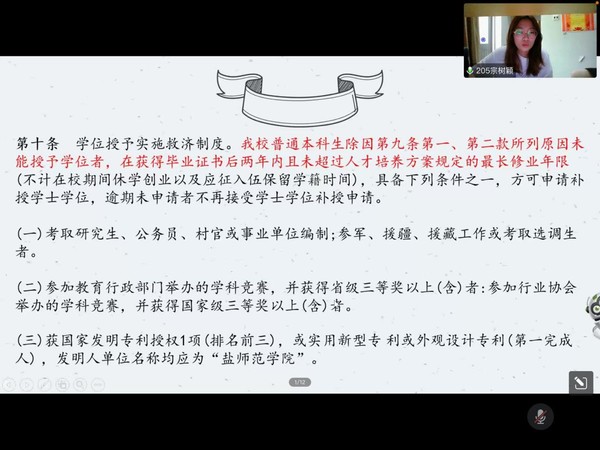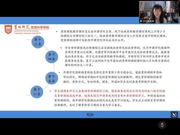 第二阶段的会议重点围绕《学生手册》中的盐城师范ky开云网页版app全日制本科生学籍管理办法、本科生学分制管理办法、本科生课程重修管理办法、普通本科毕业生学士学位授予工作实施细则等四方面的内容展开学习。