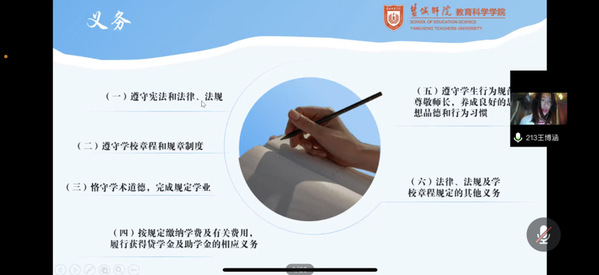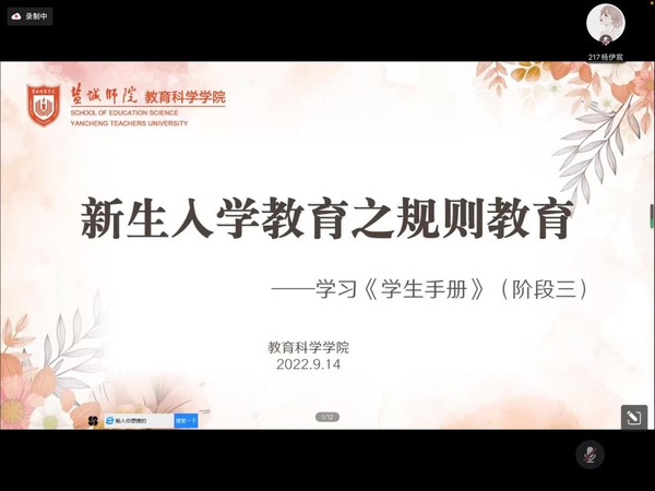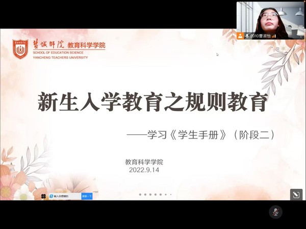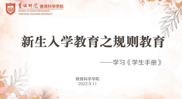 新学期伊始,教育科学ky开云网页版app积极组织新生入学教育工作系列活动。为了加强22级新生对《学生手册》的学习,让新生对学校的学生管理、教学管理等规章制度有更加深刻的了解,顺利实现由中学生到大学生的角色转变,从而科学有效地提高后期学生工作的质量,2022年9月11 日-14日期间,盐城师范ky开云网页版app教育科学ky开云网页版app为新生组织了学习《学生手册》相关内容的线上会议。