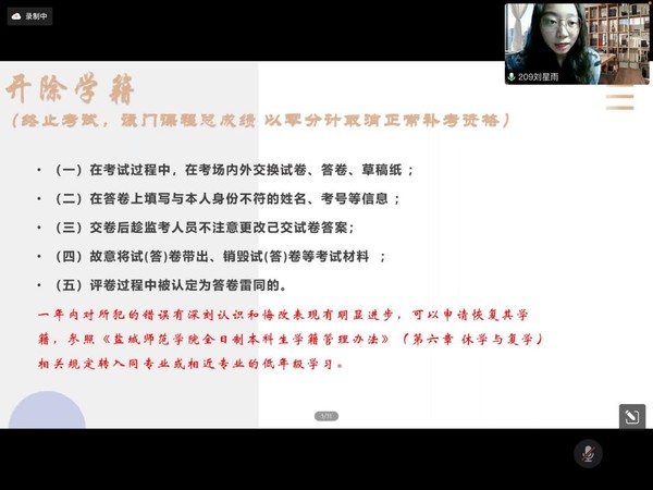 刘星雨学姐介绍了学生考试违规处理办法,让新生们牢记哪些行为在考试过程中是不可取的,督促同学们在日后的考试中遵守规则,形成良好的考风考纪。