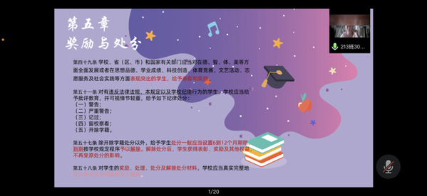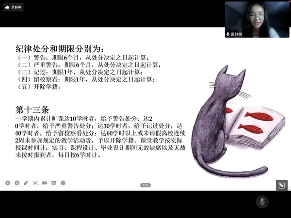 戴林楠学姐讲解了学生违纪处分实施细则,包括处分种类与期限、权限及程序、申诉及处理,明确了哪些行为是违反校规的,予以警示,切不可触碰违纪底线。