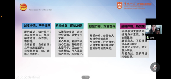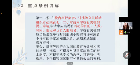 曹淑怡学姐说明了高等学校校园秩序管理若干规定。学姐对于一些规定进行着重强调,围绕校纪制度,引导学生养成牢固的行为底线。