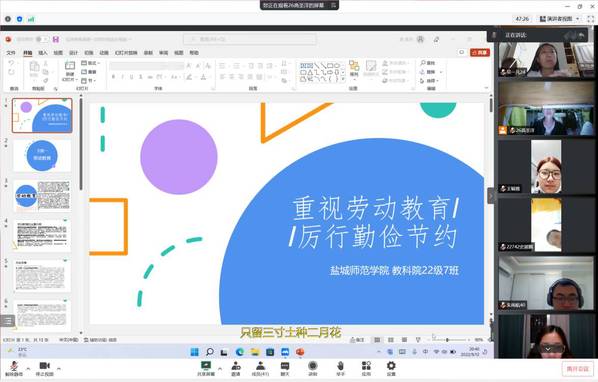 2022级各班积极部署,认真谋划,通过腾讯会议呈现了一堂堂精彩纷呈的线上主题班会,向同学们传达此次主题班会的精神,帮助同学们树立正确的劳动观,鼓励同学们把班会宣扬的精神融入到日常生活中。