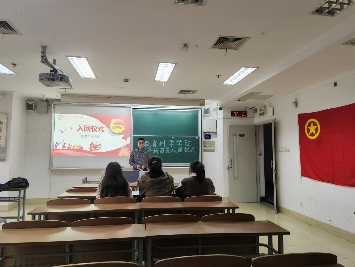 “青春展宏图,强国新征程”。在庄严嘹亮的国歌与团歌中,入团仪式缓缓拉开序幕。教育科学ky开云网页版app团委负责老师陈志鹏说明举行入团仪式的意义后,宣读新团员的名单。陈志鹏老师为新团员颁发颁发团章、团员证和团徽,团徽佩戴在左胸前,这是共青团员的象征与荣耀。在陈志鹏老师的领誓下,全体新团员举起右拳、面对团旗庄严宣誓。最后,他对新团员们提出三点要求:“作为一名共青团员,一要坚定理想信念,二要锤炼过硬本领,三要提升道德修养。希望你们以自己的青春力量绘制出时代发展宏图,开拓出强国新征程。”