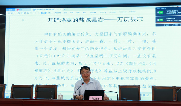 共建活动后,盐都诗书画社名誉社长何玲龙先生给现场志愿者们带来特色讲座《开辟鸿蒙的盐城县志》,介绍明·万历《盐城县志》。讲座深入浅出,引经据典,理论性和实践性紧密结合,让在场志愿者们沉浸式感受盐城地方历史文化的深厚底蕴。