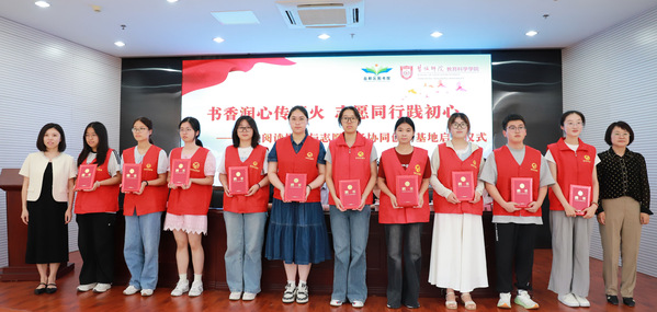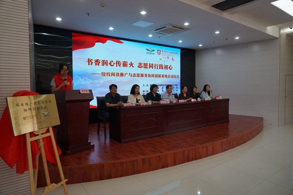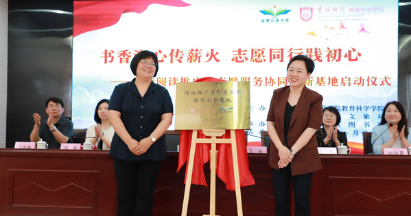 共建仪式上,冯永玲和吕杨为“阅读推广与志愿服务协同创新基地”揭牌,陈晔和韦琴为志愿者代表颁发聘书,教科院志愿者代表张琳茗作表态发言。