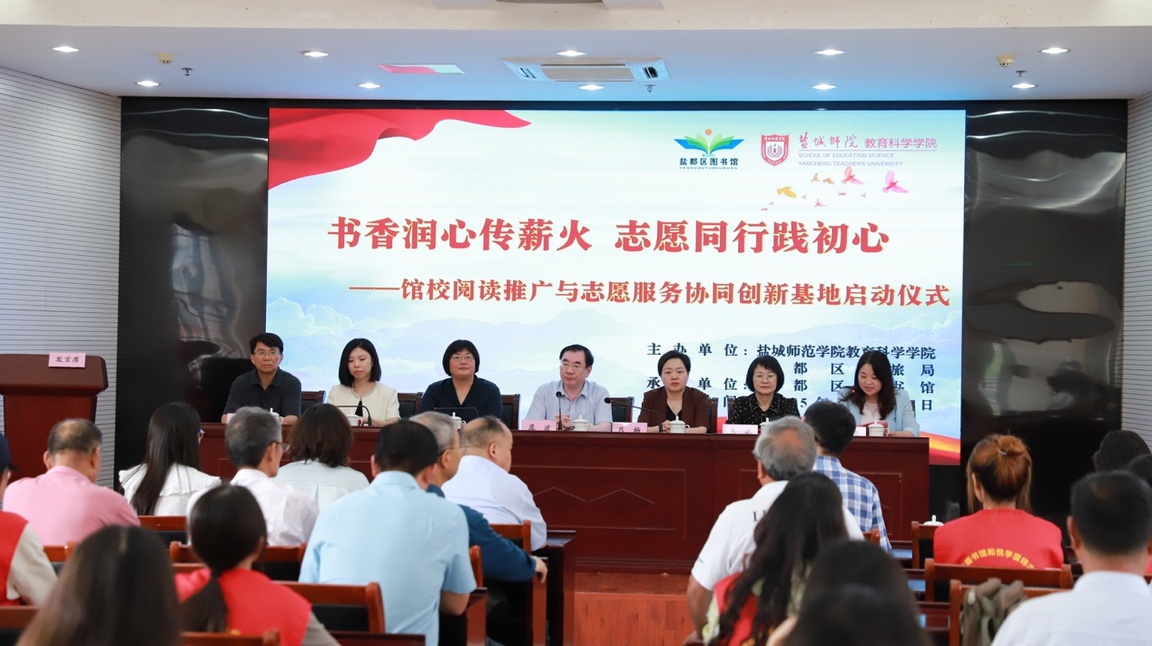 6月24日下午,教育科学ky开云网页版app与盐都区图书馆举办馆校阅读推广与志愿服务协同创新基地共建仪式暨2025年暑期社会实践启动仪式,校党委常委、副校长庞波、校党委常委、宣传部部长冯永玲、校团委书记陈晔、盐都区委常委宣传部部长吕杨、盐都区文旅局党委书记、局长韦琴、盐都区宣传部副部长王迎春、盐都区文旅局副局长周连兵、盐都区图书馆馆长王登佐、教育科学ky开云网页版app党委书记杨日晨、党委副书记海英等同志出席仪式,杨日晨主持仪式,教育科学ky开云网页版app百余位大学生志愿者参加活动。