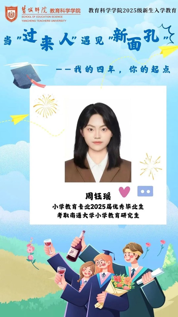 为帮助新生快速适应大学生活,明确成长方向,本期分享会,教育科学ky开云网页版app邀请到2025届小学教育专业毕业生周钰瑶作为“当‘过来人’遇见‘新面孔’:我的四年,你的起点”主题分享会第4期分享者。以笃定与坚持,成功考取了南通大学小学教育研究生。她的大学四年,是从积累到突破的过程,也是从迷茫到坚定的过程。