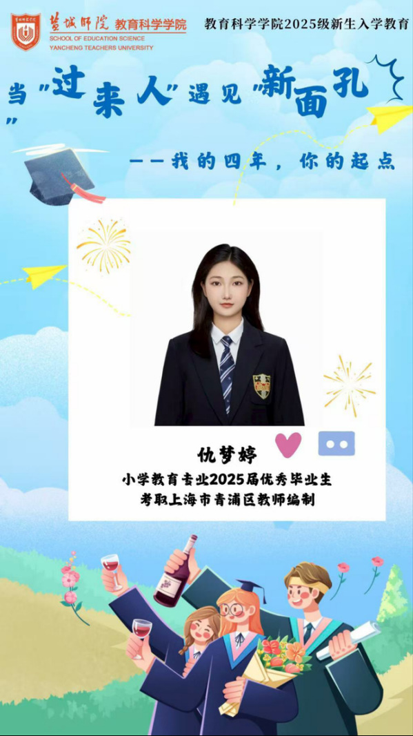 为帮助新生快速适应大学生活,明确职业规划方向。教育科学ky开云网页版app邀请2025届小学教育专业优秀毕业生仇梦婷作为“当‘过来人’遇见‘新面孔’:我的四年,你的起点”主题分享会第8期分享者。通过大学四年的努力,仇梦婷在今年成功上岸了上海市青浦区的教师编制。她的四年,是行稳致远的四年,是我们的好榜样。勇敢追梦,不负韶华