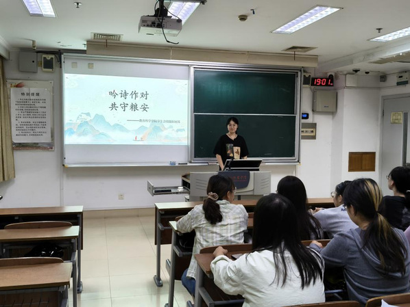 在飞花令环节中,同学们以“锄禾日当午,汗滴禾下土”的深情吟诵,感悟“粒粒皆辛苦”的农耕艰辛;借“稻花香里说丰年,听取蛙声一片”的经典传唱,描绘五谷丰登的美好图景。活动现场,诗词比拼展现文学底蕴,粮食历史解读深化认知,让新生们在文化浸润中厚植节粮爱粮情怀。